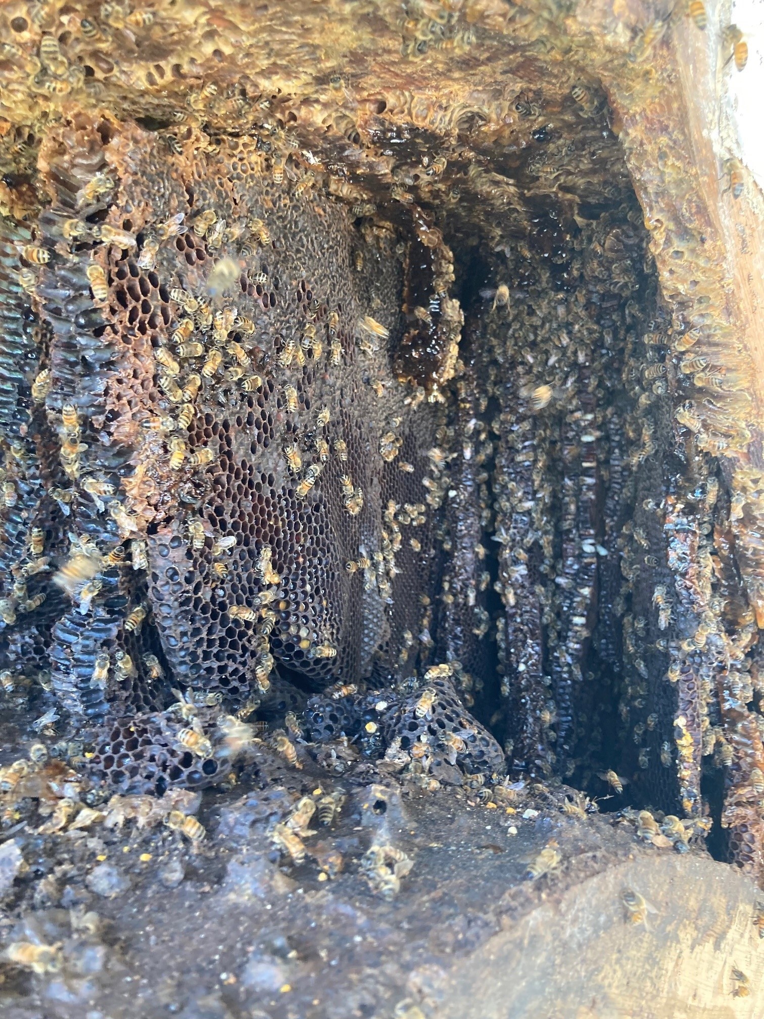 As the project got underway, Cameron, our superintendent, noticed several bees near the entrance of the clock tower.  Upon further investigation, many large honeybee colonies were located.  A local beekeeper was contracted to remove and relocate the colonies. Cameron decided to keep the job rolling by helping out the beekeeper. He operated the lift for the beekeeper and removed the wood so that the hive could be accessed.  Cameron’s efforts were rewarded with a few bee stings and a little bit of honey!